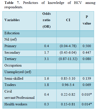Table 7 showed logistic regression model of factors influencing knowledge of respondents on HCV. Being a health worker (OR=. 0.3, CI=0.15-0.81, P=0.014) and a professional/civil servant (OR=. 0.4, CI=0.22-0.82, P=0.010) were found to be significant predictors of good knowledge of HCV. Also, respondents who had tertiary education are 3.1 times more likely to have good knowledge of HCV that those with primary and secondary education although this was not statistically significant.