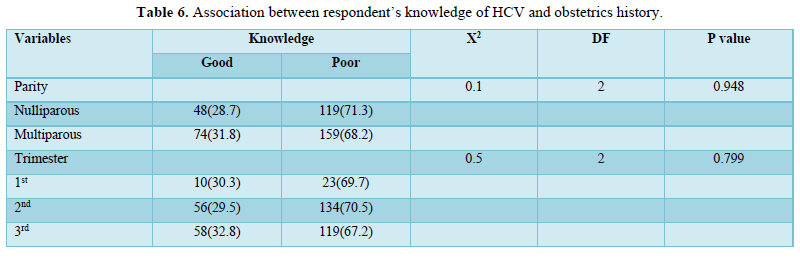Table 6 showed that there was no significant association between respondent’s knowledge of HCV and their obstetrics history.