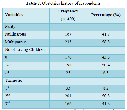 Table 2 displayed the obstetrics history of participants. About 233(58.3%) had more than one prior deliveries (multiparous), 198(50.4%) had 1-2 living children, and 201(50.3%) were in their second trimester.