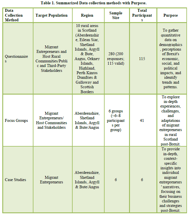 The research methodology for this study is designed to investigate the socio-economic and political impacts of Brexit on EU migrant entrepreneurs in rural Scotland comprehensively. This mixed-methods approach, grounded in Critical Realism (Bhaskar, 1978), facilitates the exploration of both observable phenomena, such as economic resilience and social integration, and the deeper systemic mechanisms shaping these outcomes. Critical Realism is particularly relevant to this research as it emphasizes the interplay between structural forces, like Brexit-induced policy changes, and individual agency in navigating entrepreneurial challenges. The philosophical foundation of this research is grounded in Critical Realism and Interpretivism, offering a balanced perspective to explore the socio-economic and political impacts of Brexit on EU migrant entrepreneurs in rural Scotland. Critical Realism acknowledges the existence of objective structures, such as economic policies and institutional frameworks, while also recognizing the subjective experiences and agency of individuals navigating these structures (Danermark, 2019). This dual perspective is particularly suited for understanding how systemic changes, such as post-Brexit policies, influence migrant entrepreneurs’ lived realities, including their business operations and sense of belonging in host communities. Critical Realism emphasizes the interplay between structure and agency, allowing this research to examine how migrant entrepreneurs adapt to or resist systemic constraints in their socio-political and economic contexts. Complementing this, Interpretivism focuses on the subjective meanings and lived experiences of individuals, particularly how they make sense of their interactions and environments (Carter & Little, 2021). This philosophy is integral to the qualitative aspects of the study, including focus groups and case studies, which aim to uncover how migrant entrepreneurs perceive and navigate challenges such as racial intolerance, access to resources, and social integration. Interpretivism aligns with the study’s goal of understanding the nuanced ways in which Brexit has reshaped migrants’ relationships with host communities and their own entrepreneurial identities. The combination of these philosophical approaches ensures a comprehensive exploration of the research objectives. Critical Realism provides the structural lens necessary to examine policy impacts, economic disruptions, and systemic barriers, while Interpretivism captures the human element-how individuals experience, interpret, and respond to these broader forces. This alignment informs the mixed-methods approach adopted in the study, integrating quantitative methods to identify patterns and trends with qualitative methods to explore deeper, contextualized narratives (Maxwell, 2021). For instance, quantitative survey data highlights economic challenges and policy impacts, while qualitative focus groups and case studies provide rich, narrative-driven insights into personal resilience and community dynamics. By adopting these complementary philosophical stances, the research bridges the gap between objective analysis and subjective understanding, ensuring methodological rigor and depth in addressing the multifaceted impacts of Brexit. This approach not only supports the theoretical and conceptual frameworks but also provides a robust foundation for the mixed-methods design, enabling the study to contribute meaningfully to academic and policy discourses on rural migration, entrepreneurship, and integration. Complementing this philosophical orientation, an interpretivist perspective is adopted to foreground the subjective experiences and narratives of migrant entrepreneurs. This approach ensures a balanced exploration of statistical trends and qualitative insights, providing a nuanced understanding of migrants’ sense of belonging, identity, and resilience in rural Scotland (Creswell & Creswell, 2018). To achieve its objectives, the study employs a mixed-methods research design, integrating quantitative and qualitative approaches for methodological triangulation. Quantitative data were collected using structured questionnaires administered to 280 participants, comprising 120 EU migrant entrepreneurs and 160 members of rural host communities and stakeholders. These questionnaires combined closed-ended questions, which enabled statistical analysis, with open-ended questions that captured nuanced individual perspectives. The qualitative component included six focus groups, divided evenly between migrant entrepreneurs and host community members, and six in-depth case studies representing diverse entrepreneurial endeavors across Scotland's rural regions. These methods provided a rich dataset that contextualized quantitative trends with qualitative depth.