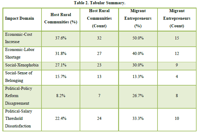 The quantitative analysis highlights key differences between the experiences of Host Rural Communities and Migrant Entrepreneurs across economic, social, and political dimensions, based on responses from 85 host community members and 30 migrant entrepreneurs.