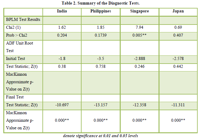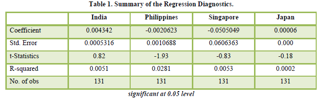 Table 2 provides the Breusch-Pagan/Cook-Weisburg test result for heteroskedasticity for each of the four countries. The data for Singapore showed the presence of heteroskedasticity (p-value <0.05), while the data for Japan, India, and the Philippines were homoscedastic, as their p-values are greater than 0.05. Further, the initial Augmented Dickey-Fuller (ADF) test result was conducted and revealed that the exchange rate volatility variables for each country have unit root and were stationary. Thus, another ADF test was administered, where the exchange rate volatility series were differenced to eliminate non-stationarity. The results revealed that the test statistic Z(t) and MacKinnon approximate p-values were less than 0.05 level, which led to the data becoming stationary after differencing.