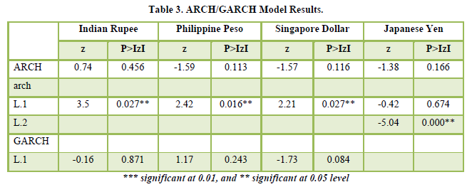 Table 3 indicates the outcomes for both a GARCH (1,1) model and an ARCH (1) model for India, the Philippines, Singapore, and Japan’s datasets. The ARCH model test results indicated the presence of significant volatility in the exchange rates in these countries during the period 2011-2021. Therefore, the significance of the lagged ARCH terms (the second lag for Japan, as GARCH cannot be applied to the dataset) and the first lag for India, the Philippines, and Japan led to the rejection of the null hypothesis. This proves that there is significant exchange rate volatility in all four countries, which was a prerequisite for the subsequent linear regression analysis.