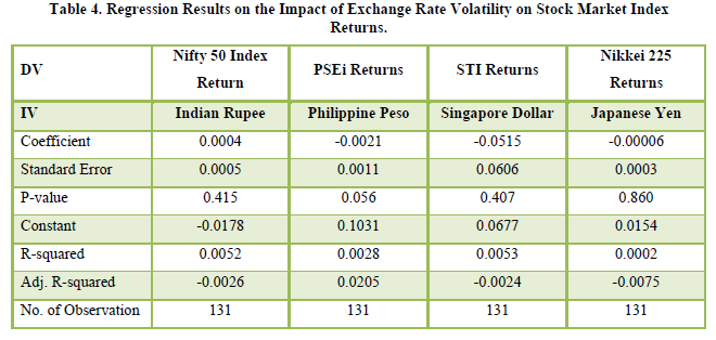 Table 4 shows the linear regression test results for the impact of exchange rate volatility on stock market index returns in the four Asia Pacific countries. The p-value generated for each of the country’s exchange rates is greater than the 0.05 level, thus, the null hypothesis was not rejected. We can infer that foreign exchange volatility (USD/INR, USD/PHP, USD/SGD, and USD/JPY) in these countries showed no effect on their respective stock market index returns over the 2011-2021 period.