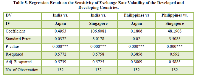 Table 5 provides the results of linear regression estimation to determine differences in the sensitivity of exchange rate volatility between developed and developing countries. Based on the p-values for all four pairs (India vs. Japan, India vs. Singapore, Philippines vs. Japan, and Philippines vs. Singapore), the results are 0.0000, which is less than the significance level of 0.05. The results are statistically significant, and these reject the null hypothesis, which proves that developing countries were less sensitive to exchange rate volatility than developed countries. This is supported by the finding of Zada et al. (2021), which suggested that developing markets are more prone to recurrent jumps.