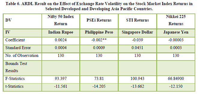 - The regression results proved a weak impact of exchange rate volatility on stock market index returns for Japan, Singapore, and India in the long run, but showed a statistically significant negative long-run effect in the Philippines. However, the ARDL bounds test provided evidence of a statistically significant long-run relationship between exchange rate volatility and their respective stock market index returns. The results for the other countries did not reveal statistically significant long-run effects of exchange rate volatility on their respective stock market index returns. It also suggests that although the direct linear impact of exchange rate volatility on stock returns in the long-run regression might be weak or influenced by other factors, the two variables seemed to be moving together in the long term.