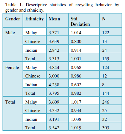Most literature finds that females tend to recycle more than males [5-9]. But little is known pertaining to the practice of the different races in a multiracial country like Malaysia except for studies by Meen-Chee, Narayanan, Omran, Mutang and Haron [7,8,10]. Is there a difference between males and females in terms of recycling practices? Are there differences among the ethnicities in their recycling behavior and is there an interaction effect of gender and ethnicity?