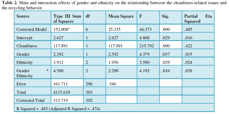 When analyzed using the General Linear Model for the main and the interaction effects of gender and ethnicity on the relationship between cleanliness-related issues and the recycling behavior (Table 2), results show that the cleanliness-related issues can explained for 42.2% on the recycling behavior. Females (M=3.795, SD=0.982) recycle more than males (M=3.313, SD=1.001) and the difference is significant (F=4.379, p=.037) with a contribution of 1.5% on the recycling behavior. Therefore, H2 is supported.