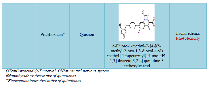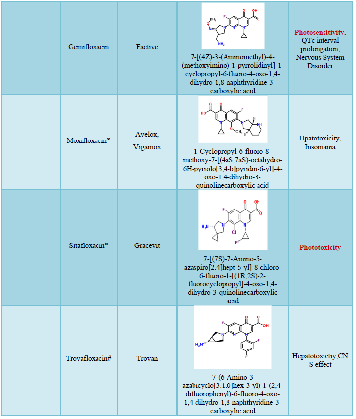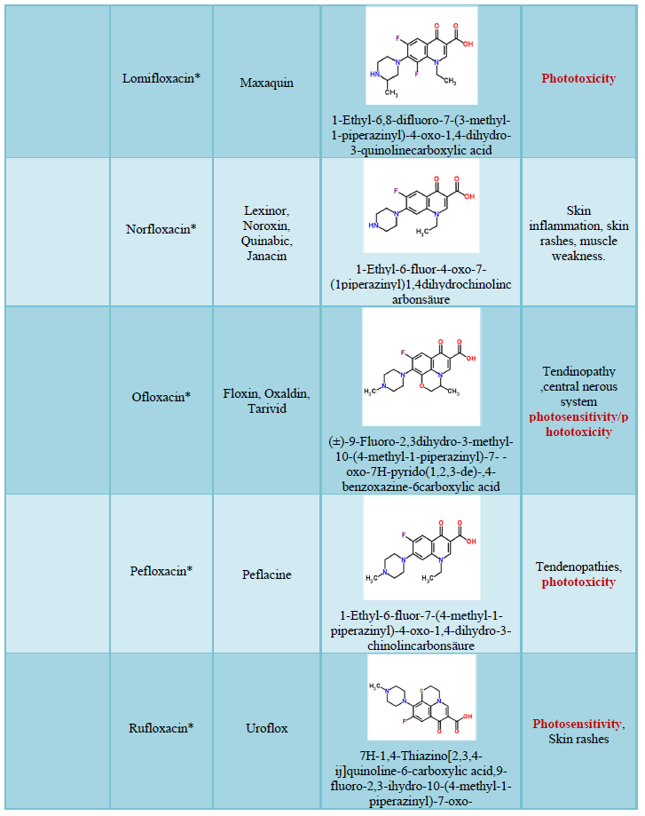 The term photosensitization is connected with phototoxic and photoallergic reactions in skin which are mainly visualized by systematic administration or topical application of phototoxic chemical/drug. Chemical phototoxicity is an adverse human skin reaction induces by the combined effect of exogenous chemical agents (for example drugs, hair dye, sunscreen and food preservatives) and light, mainly the exposure of visible (400-700 nm) and ultraviolet (UV) A and B (320-400 nm and 290-320 nm, respectively) wavelengths. Several feature such as absorption and metabolism of phototoxic compound also affect the individual’s response to photosensitive agents. Amount of light penetration in skin also influences the phototoxic effect because it differs among individuals due to the genetic and environmental factors. Fluoroquinolones are used for intra-abdominal infections and community-acquired pneumonia type infectious disease. Scientists have reported reported that 10% of patients receiving fleroxacin, lomefloxacin and sparfloxacin are known to be significantly photosensitized while ciprofloxacin, enoxacin, norfloxacin and ofloxacin have been reported to be less phototoxic. In a control study on Caucasian people, it was found that sparfloxacine induced clinically phototoxicity effect while levofloxacine and sitafloxacine failed to exert significant adverse effect.