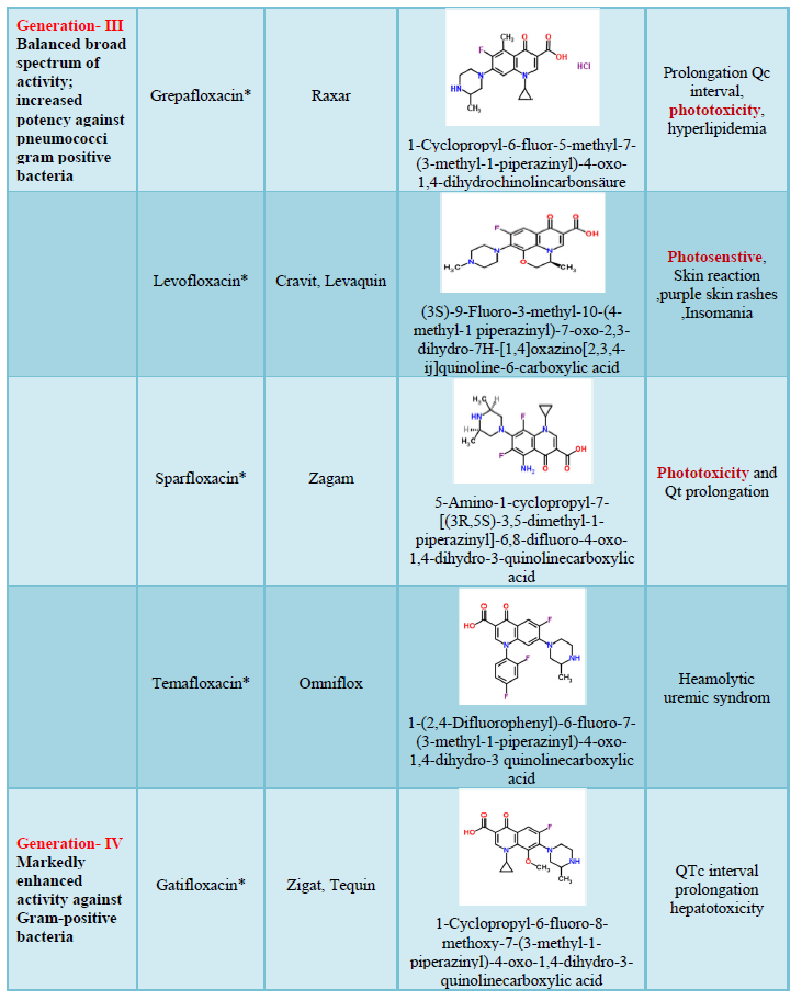 Nalidixic acid (have limited activity toward gram negative bacteria) was developed in 1962 by Lescher and his colleagues. First generation of fluoroquinolones was developed in 1982 with 6 fluorinated derivative (norfloxacin, ofloxacin, ciprofloxacin) which have better activity against gram negative bacteria [14]. Usually fluoroquinolones were classified on the basis of generation. The antibacterial activity of this drug has been augmented as different generations of quinolones were developed. Second generation quinolones have a moderate effect on gram positive bacteria with improved action spectra towards gram negative bacteria compared to first generation [8]. A third generation has good potency towards anaerobic and gram-positive bacteria especially towards Pneumococci. Fourth-generation fluoroquinolones have shown better treatment towards pneumococci and anaerobes [15]. Clinical use of second generation was limited because of its poor bioavailability and renal toxicity while the third generation of fluoroquinolones expands its clinical utility in the field of ophthalmology for therapy of eye infection and topical application in bacterial keratitis [16]. Fourth generation quinolones moxifloxacin and gatifloxacin has been approved by FDA for topical application because of their dual mechanism of action towards the gram positive and gram-negative bacteria [17]. In Table 1 we have discussed about the classification of different generation of fluoroquinolones.
