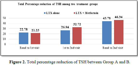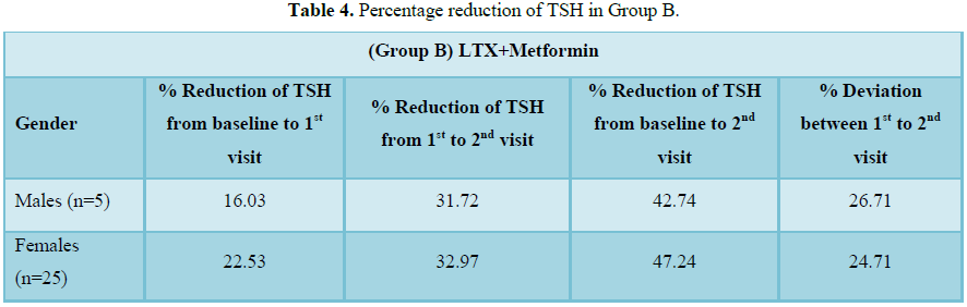 (LTX 25 mcg OD alone), group B (LTX 25 mcg+Metformin 500 mg OD). The TSH levels
