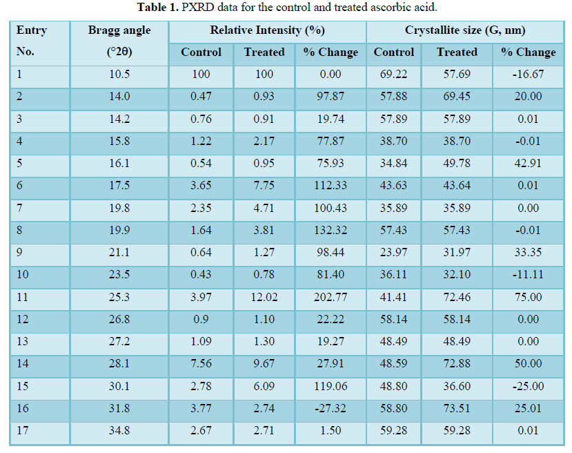 peak intensities and crystallite sizes of the treated ascorbic acid were