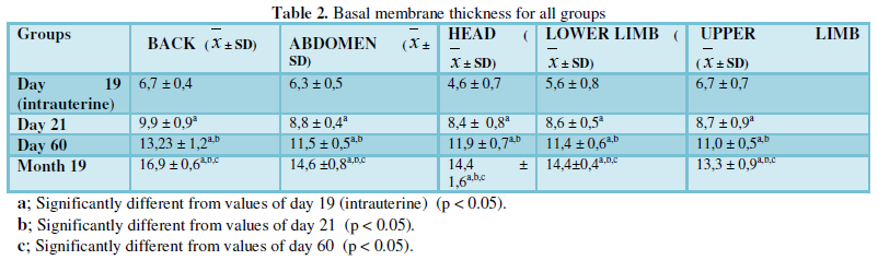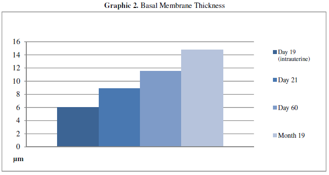 19 (intrauterine) group had the thinnest basal membrane, while the thickness