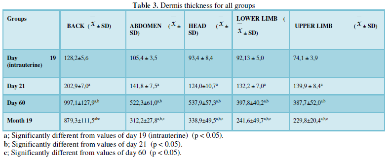 dermis. In the aged group, the hypodermis was quite evident, while the dermis