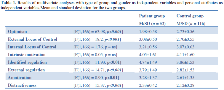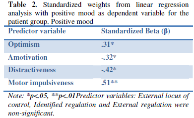 Results from the patient group is shown in table 2. In order to assess the extent to which positive mood may predict the result outcome pertaining to the variables estimated in optimism, external locus of control, identified regulation, external regulation, amotivation, distractiveness and motor impulsiveness, a regression analysis was performed with each of the former as independent variables and positive mood as dependent variable. Regression analyses indicated that positive mood (F (7, 44) = 5.141, p<.001, adj. R2=.36) was predicted by optimism and motor impulsiveness, and was counter predicted by amotivation and distractiveness.
