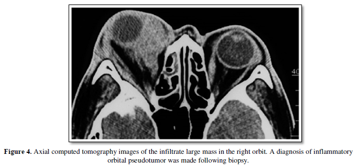 On the basis of histopathological analysis, a second surgery may be performed after biopsies. In this series, orbital exenterations were performed after biopsy in eight patients. Diagnostic biopsies were also performed for patients with inflammatory orbital pseudotumors, which are difficult to differentiate from infiltrative tumors (Figure 4).