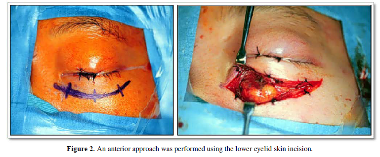 The anterior approach is indicated for anterior orbital tumors [7]. This approach has the advantage of exposing the tumor without orbitotomy. However, once the tumor extends behind the globe, the operative field is limited with this method. The anterior approach should therefore be limited to tumors that are located in the anterior half of the globe (Figure 6) [14].