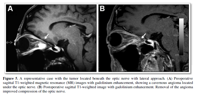 All patients were examined using computed tomography (CT) and magnetic resonance imaging (MRI) to determine tumor location and size. Neuro-ophthalmic functions, such as ocular fundus, visual acuities, visual fields and Hess charts, were also assessed before tumor removal. These assessments informed our selection of surgical approach.