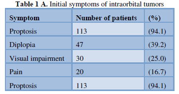 Purpose: Orbital tumors are relatively rare. Surgical resection of these tumors can be challenging on account of the complexity of intraorbital anatomy. Intraoperative injuries to intraorbital structures may result in severe complications; the surgical approach must therefore be carefully selected. We present a case series of 120 patients surgically treated for orbital tumors between 1990 and 2005.