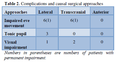 Results: Postoperatively, three patients experienced visual impairments, three exhibited tonic pupil, and two developed permanent eye movement impairment.