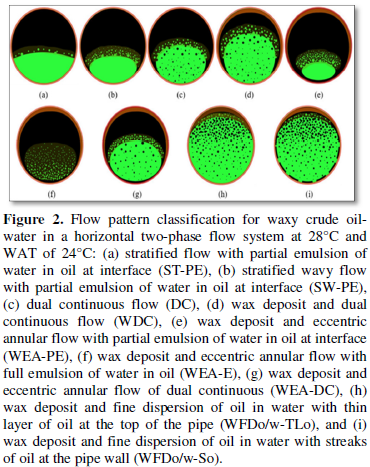 The presence of paraffinic waxes, regardless of their proportion, in all types of crude oils highlights the significance of any type of multiphase flow study with respect to these components [5]. Nevertheless, research works done on oil-water two-phase flows have mostly been restricted to the use of model oils (i.e., synthetic or mineral oils) rather than actual crude oils [6-8]. Although this practice is accepted as an attempt to improve the general knowledge on the subject, recent studies have shown that overly simplistic model oil cannot be a perfect representative of complex crude oils in terms of flow behavior. Therefore, as the first attempt, this research was aimed at studying the flow behavior of a typical Malaysian waxy crude oil in an