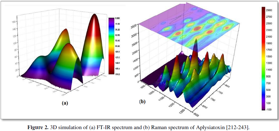Aplysiatoxin is a cyanotoxin produced by certain cyanobacteria species. It is used as a defensive secretion to protect these cyanobacteria from predation by fish, being a potent irritant and carcinogen, by acting as a powerful activator of protein kinase C. While this action has a tumor–promoting effect, protein kinase C activation can be medically beneficial for some other applications, and synthetic analogues of aplysiatoxin have been researched for anti-cancer effects. Parameters such as FT-IR and Raman vibrational wavelengths and intensities for single crystal Aplysiatoxin are calculated using density functional theory and were compared with empirical results. The investigation about vibrational spectrum of cycle dimers in crystal with carboxyl groups from each molecule of acid was shown that it leads to create Hydrogen bounds for adjacent molecules. The current study aimed to investigate the possibility of simulating the empirical values. Analysis of vibrational spectrum of Aplysiatoxin is performed based on theoretical simulation and FT-IR empirical spectrum and Raman empirical spectrum using density functional theory in levels of F/6–31G*, HF/6–31++G**, MP2/6–31G, MP2/6–31++G**, BLYP/6–31G, BLYP/6–31++G**, B3LYP/6–31G and B3LYP6–31–HEG**. Vibration modes of methylene, carboxyl acid and phenyl cycle are separately investigated. The obtained values confirm high accuracy and validity of results obtained from calculations.