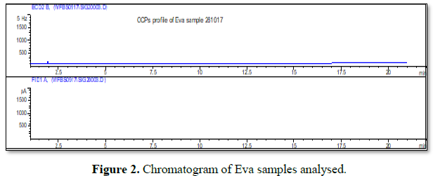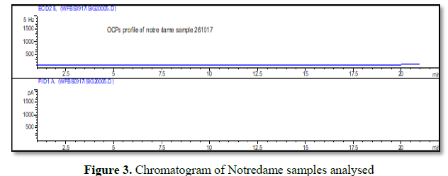 The chromatogram result in this study is in consonance with that of Food and Drug Administration [1] who assessed potable water in Addo Ekitti, Ogun and Benin. Reports from this investigation reveal that Organochlorine pesticide residues were below detection limit (BL) (0.00 ± 0.00) in Table 1.