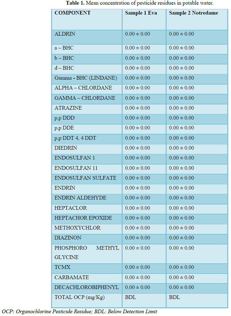 Twenty five pesticides were assessed in potable water (Table 1) and all were below detection limit (0.00 ± 0.00) for both samples (Eva and Notredame).