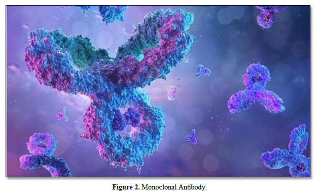 Monoclonal antibodies are a type of antibody produced in the laboratory that can be used in diagnosis or treatment. They block the growth of blood vessels in tumors, or they may assist the immune system in killing cancer cells. Monoclonal antibody treatment can lead to side effects for patients. Its side effects can include fever, chills, weakness, headache, nausea, vomiting, diarrhea, low blood pressure, and rash (Figure 2).