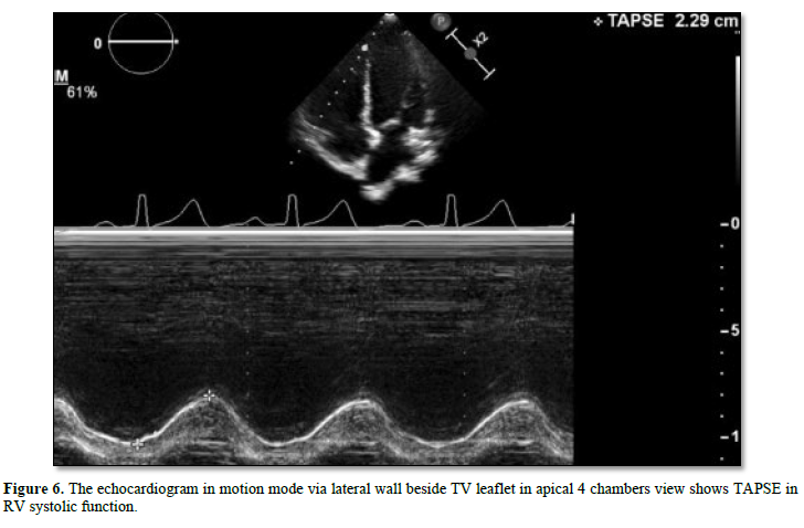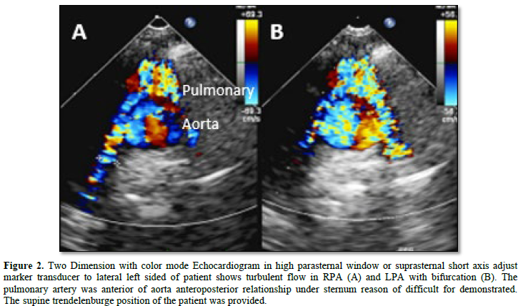 The modified parasternal long axis view with anterior angulated transducer was the use of the demonstrated pulmonic valve and infundibular part. The overriding aorta may be considering outflow tract obstruction leading of increase pulmonary pressure and right-side cardiac pressure able to push blood from the right ventricle insufficient to right atrium chamber (Figure 4). Tricuspid regurgitation pressure gradient (Normal TRPG < 35 mm Hg) [17] and pulmonary end diastolic pressure (PREDP), It’s able to estimate right atrium pressure (RAP) about 5-10 mm Hg if inferior vene cava size < 2.1 cm. And collapsing signs >50%. [18] The formula for calculating RVSP = TRPG + RAP (mmHg.) (RVSP; right ventricular systolic pressure, RAP; Right atrial pressure). The RVSP will equal systolic PAP when without pulmonary valve stenosis. But the PS or PPS evidence must be reported and the calculation method may be using another formula.