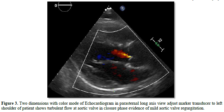 The outflow tract and semilunar valve function both aortic and pulmonic valves used the parasternal long axis view (Figure 2) and modified parasternal long axis view with anterior angulation of transducer. Because of aortic root dilated and valve regurgitation was common occur approximately 22% in ten years follow up [15]. The parasternal short axis view was a limitation for demonstrating both semilunar valve in same view (Figures 2 & 3). The overriding aorta may be considering the cause of obstruction the outflow tract after closure septal defect [16].