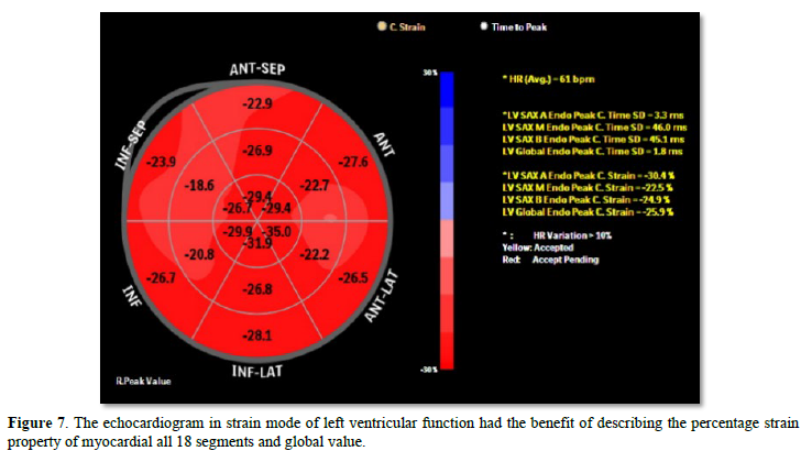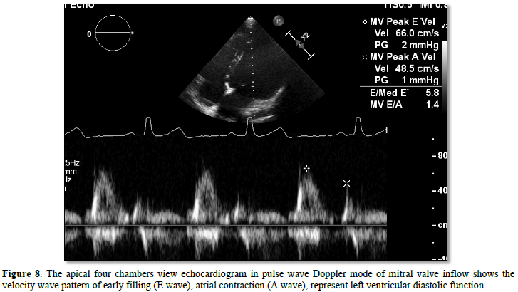 The reason for coronary artery relocalization procedure has influence to the coronary supply and regional wall motion of LV Although the main of pumping was the left sided ventricle (after repair). But in several cases the morphology of main ventricle was more trabeculation or noncompacted. This point was considered evidence of reducing ventricular pumping and related to impair ventricular function. The left ventricular ejection fraction (normal LVEF > 55%) in systolic function, the circumferential or longitudinal strain was important parameter for described neo-left ventricular function [10]. (Normal global longitudinal strain -15% to -22%) [19]. After some report use -20% cut off point for considering normal [20]. However, the right ventricular function was also necessary, in addition the tricuspid annulus plane exertion which is a parameter for evaluating RV function and many cut points in several main diseases such as in pulmonary hypertension if TAPSE < 1.6 cm. (since 1.5 cm. below) It’s being able to detect elevated pulmonary pressure in patients with interstitial lung disease who underwent cardiac catheterization [21]. (Accept rang > 1.5 cm.) There is also tissue Doppler velocity of S' wave at lateral wall beside leaflet of the tricuspid valve that can be a parameter used to evaluate RV function. (Normal > 11.5 cm/s) [22]. About the diastolic function E/E’ at mitral valve inflow able to reflect the filling pressure of LV and LA contraction. The peak velocity of E wave of mitral valve inflow by pulse wave Doppler (Figures 5-8) and the peak velocity of E’ wave of tissue pulse wave Doppler able to ratio E/E’ if greater than 15 may be related to elevate left atrial pressure, such as mitral stenosis or regurgitation and pulmonary vein stenosis or pulmonary hypertension. (Normal < 15) [23].