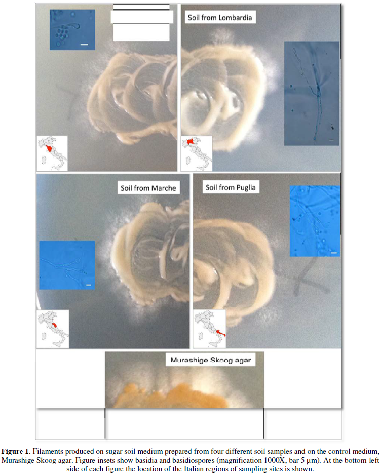 The four media prepared with the four soil samples presented different pH values ranging from 7.6 to 7.9. Soil from Lombardia presented the lowest pH and that from Puglia the highest one (Table 1). The two reference strains were able to grow on all soil media with a visible growth after 48 h of incubation. On SSM agar, filaments become macroscopically visible at the edge of the streak of all mixed cultures at days 7 of incubation. The same streaks produced basidia and basidiospores at day 15. On SM, filaments and basidiospores were produced only on two mixed culture streaks (soil samples from Lombardia and Marche) at day 16 and 30, respectively (Table 1 and Figure 1). As expected streaks inoculated with JEC20 or JEC21 strains alone did not produce any filament in all plates. The two tester strains confirmed their ability to mate on Murashige and Skoog medium.