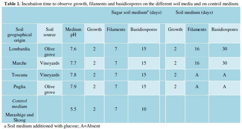 Soil medium (SM) was prepared dissolving 50 g of soil in 500 ml of distilled water. The suspension was boiled for at least 30 min and then filtered throughout some overlapping pieces of gauze. Volume was adjusted with further distilled water and 20 g of agar were added. The medium was sterilized by autoclave and then poured in 90 mm Petri dishes. For sugar soil medium (SSM), 2.5 g of glucose were added. Medium pH was measured before storage at 4°C. In addition Murashige Skoog medium (Sigma-Aldrich, Milano, Italy) was prepared as control mating medium.