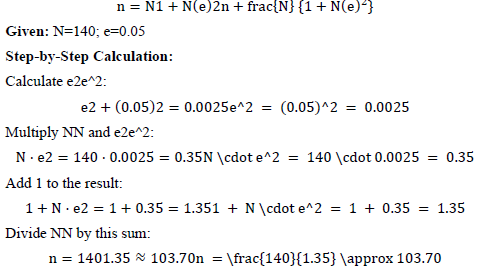 The calculated sample size nn is approximately 104 (rounded to the nearest whole number).