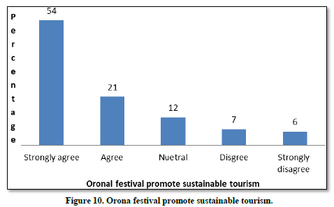 54% respondents strongly agree that Orona festival can promote tourism, 6% of the respondents strongly disagree that it not promotes tourism This finding is consistent with Esu & Arrey, (2019) who reported that is significant relationship between cultural festivals and tourism (Figure 10).