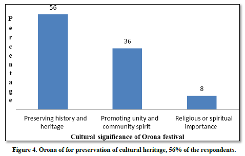 Figure 4 Shows the importance of Orona of for preservation of cultural heritage, 56% of the respondents said it very important because it preserve history and heritage, while5% said it preserve religious and spiritual importance.