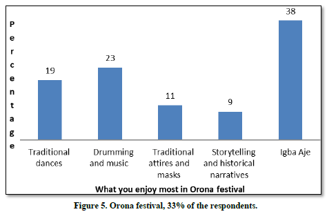 Figure 5 below shows what responds enjoy most in orona festival,33% of the respondents said Igba Aje, 23% of the respondents drumming and music, 9% storytelling and historical narratives which is the lowest.
