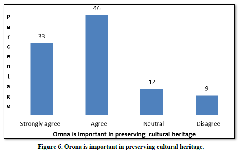 Orona is important in preserving cultural heritage, 46% 0f the respondents agree, 12% of the respondents were neutral and 5% of respondents strongly disagree. This finding aligns with the study conducted by Aleshinloye et al. (2017), which highlighted that the Osun Oshogbo festival has the potential to safeguard cultural heritage and uphold traditional belief systems (Figure 6).