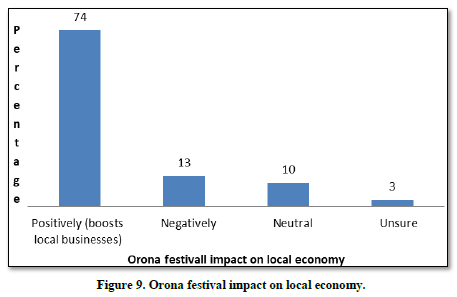 Figure 9 below shows the impact of Orona festival on local economy. 74% of the respondents said it has positive boost of the local economy, 2% said unsure how will impact on the local economy. This finding is consistent with Ogundiran, (2014) who reported that Osun Oshogbo groove has positive social-economic impact on the hospitality and tourism business for the local communities.