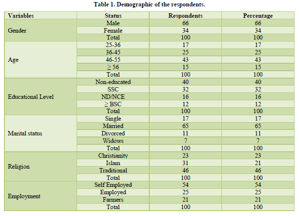 Table 1 shows the demographic of the respondents., 66% of respondents are males 34% of the respondents are females, 46-55 age bracket with 43% was the among the respondents while, ≥ 56 with 15% was lowed among the respondents. Also, the educational level shows that non-educated 40% among the respondents, while ≥ BSC with 15% was the lowest. 65% among the respondents were married and 7% windows the lowest. 46% of the respondents were traditional worshipers, and 23% I Christianity adherents was the lowest. The employment level shows that 54% among the respondents were self-employed while, 21% w of the respondents were farmers.