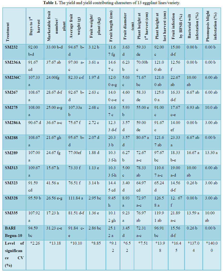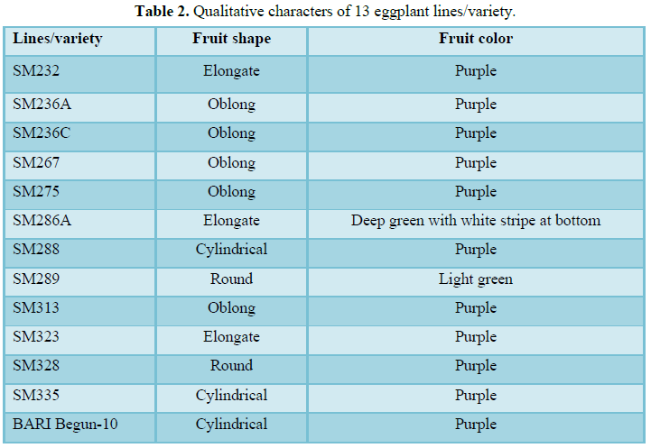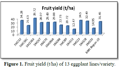 Mean performances of eggplant lines/varieties are presented in Tables 1 and 2 and Figure 1. The lines varied significantly for their response to days