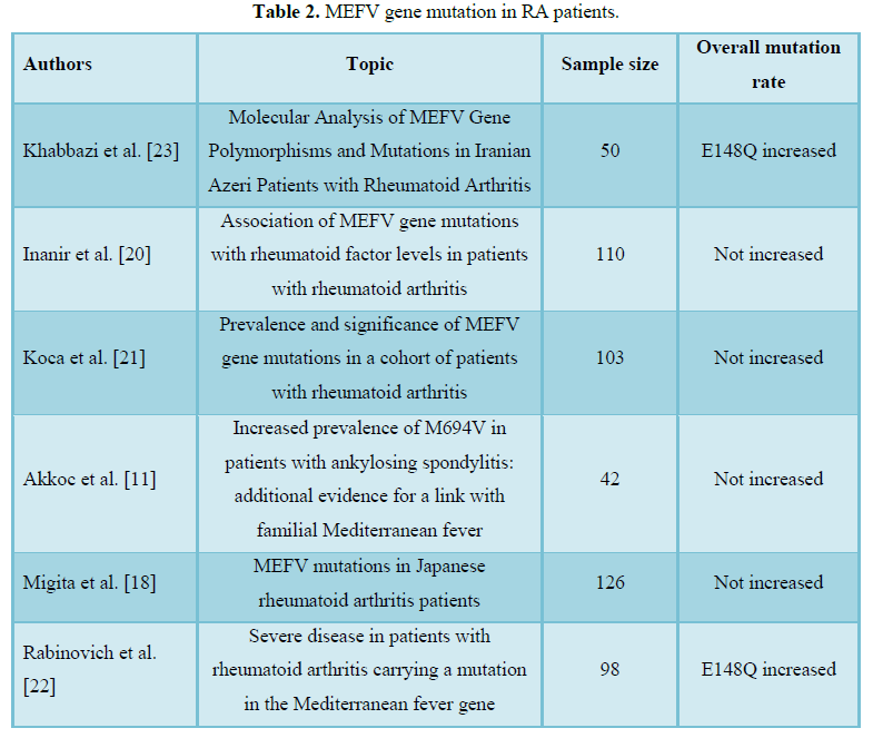 There are other studies which carried on patients with rheumatoid arthritis (RA). Most of them assessed the most common mutations of MEFV gene, but, none of them reported an association between MEFV gene mutations and rheumatoid arthritis [11,18-21]. The study which performed in 2005, showed increased mutation rate of exon 2 of MEFV gene (E148Q) in patients with RA, but, the influence to the prognosis was less likely [22,23]. We also performed genetic study on exon 2 and 10 of MEFV gene on thirty four patients with refractory rheumatoid arthritis and healthy control subjects. The results of our study was the same, there was no significant relationship between MEFV gene mutations and patients with refractory rheumatoid arthritis [24,25]. The Table 2 presents the studies conducted on patients with rheumatoid arthritis (RA).