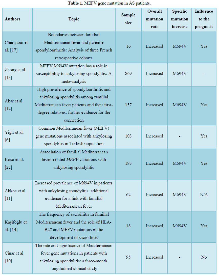 According to the studies mentioned in Table 1, there is an association between MEFV gene mutations and sacroiliitis as a dominant feature of AS. But another question still remains that is there any possible relation between these mutations and other inflammatory arthritis?