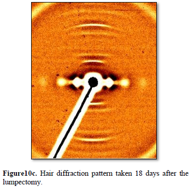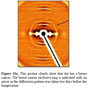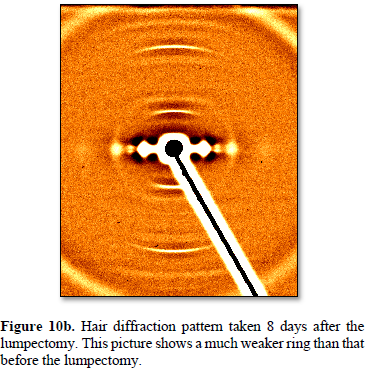 Looking at the case of a patient who underwent a lumpectomy for a small cancer, after her surgery her doctor insisted that she take chemotherapy and radiation. The diffraction pictures tell her story (Figures 10a-10c).