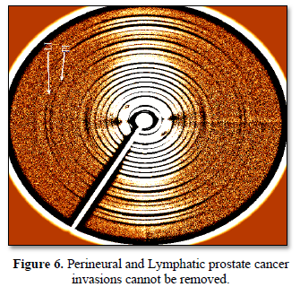 This is the time for the prostate cancer to be removed by chemotherapy, saving the young patient a lifetime of problems. There is no need for surgery. The total removal of the prostate cancer can be verified by a further diffraction study after every dose of chemotherapy to check whether or not the cancer had been removed. Such low-grade cancers have been found in diffraction studies of men from eighteen years up. This reported discovery was ignored by the medical profession. [9-12]. However, if no action is taken at this early stage, this low-grade prostate ring gets wider and wider till it reaches the 15th order at Gleason7 and becomes even wider after that. Further rings now appear on the 17th and/or the 18th orders simply because the prostate cancer has escaped into the body either via the lymph nodes or through the surface as a result of treatments. In one of my recent sets of samples from prostate patients, 19 out of 29 patients showed a Perineural invasion. A pattern from such a high-grade prostate patient is shown in Figure 5.