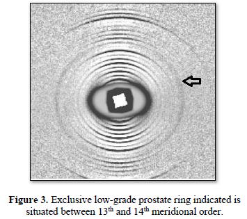 The same exclusive low-grade prostate ring was also found in the low angle X-ray diffraction patterns of TRAMP transgenic mice, 3 days after birth, and some days before any other test could detect that these were transgenic mice (Figure 4).