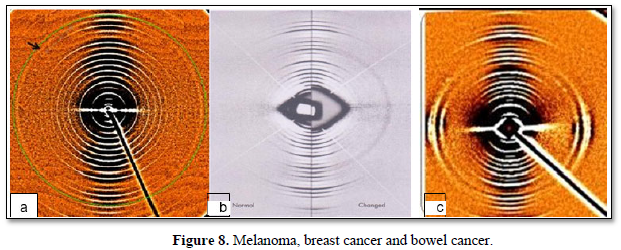 Breast cancer also shows up in hair, as illustrated in Figure 9. The added ring for breast cancer shows out clearly superimposed on the normal hair pattern.