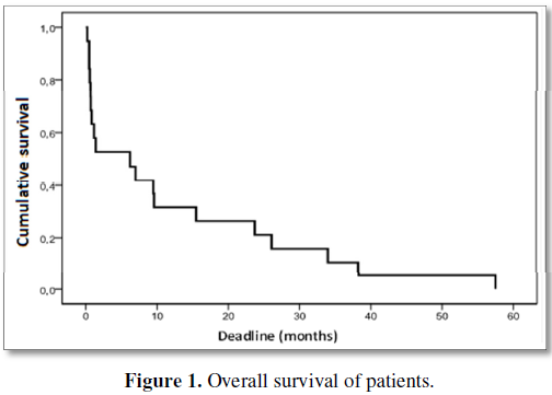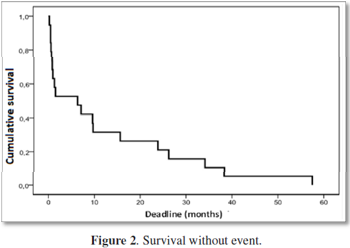 There is a statistically significant difference (P=0.018) between survival without event and age; the response in patients younger than 60 was better. The median for the age group <60 years is 7.0 months while for the age group ≥ 60 years it was 0.6 months. However, the Chinese study found that elderly patients (>60 years) have a higher overall survival than younger patients (≤ 60 years) [19]. Patients over 60 years of age less supported the disease and treatment probably due to comorbidities and advanced stage of the disease.