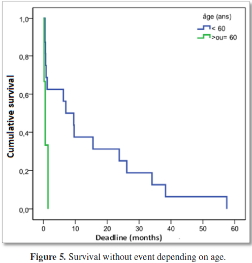 The duration of follow-up was 12 months whereas the median of overall survival was 10.5 months. Overall survival was 50%, 41.7% and 8.3% respectively at 1 year, 3 years and 5 years. The Median survival without event was 6.2 months. The survival without event was better for the age group <60 years (7.0 months) compared to the age group ≥ 60 years (0.6 months). The median survival with event was 16 months. In South Korea, Jang et al. [4] in 2011, in a series of 177 patients had a median follow-up duration of 52 months, a mean survival without event and overall survival at 3 years of 62 and 74%, respectively. The difference between the 2 series would be related to the fact that all patients in the Korean series had more lymph nodes involvement in most cases, a WHO score between 0 and 1 and that the R-CHOP protocol was the mostly used. In France, the 5 year survival for the entire cohort was 59% [18]. In Tunisia, overall survival at four years was 56%. Event-free survival was 49% [7]. Tolo et al. [8] observed event-free survival at 3 years was 32% and overall survival at 3 years was 50% [8]. The 3-year survival in the Ivorian series was superior to ours (41.7%); our poor survival rate is explained by the advanced stage of the pathology during the first contact with the specialist, the underutilization of the immunotherapy and the lack of recourse to therapeutic intensification.